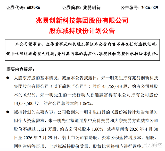 4月7日,兆易创新发布公告称,公司控股股东、实控人朱一明因个人资金需求,计划通过集中竞价和大宗交易方式减持公司股份不超过1121万股,约占公司总股本的1.60%。其中,集中竞价减持不超过700万股,大宗交易减持不超过421万股。