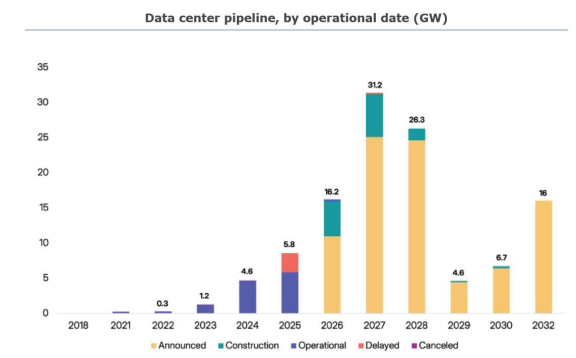 计划在2028年至2032年间投入运营的大多数数据中心甚至尚未动工。另有37吉瓦的规划基础设施尚未确定确切的竣工日期,其中只有4.5吉瓦真正开工建设。